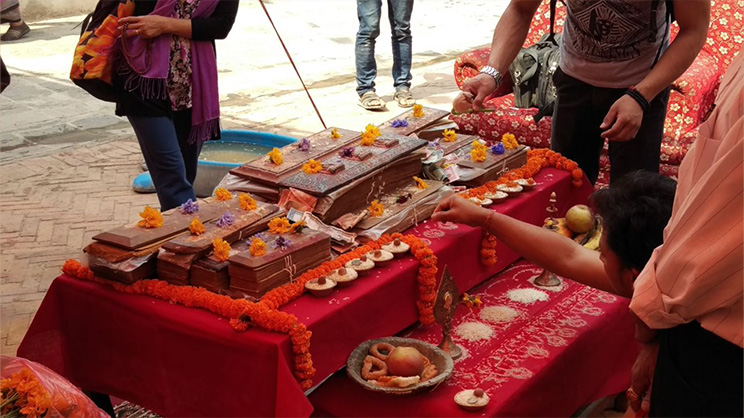 ―Lectura ritual de los “nueve Sutras” (Navagrantha-patha) según la Tradición Newar, Boudhanath, Katmandú, 2016. Imagen de Alexoneill, CC BY-SA 4.0, via Wikimedia Commons―