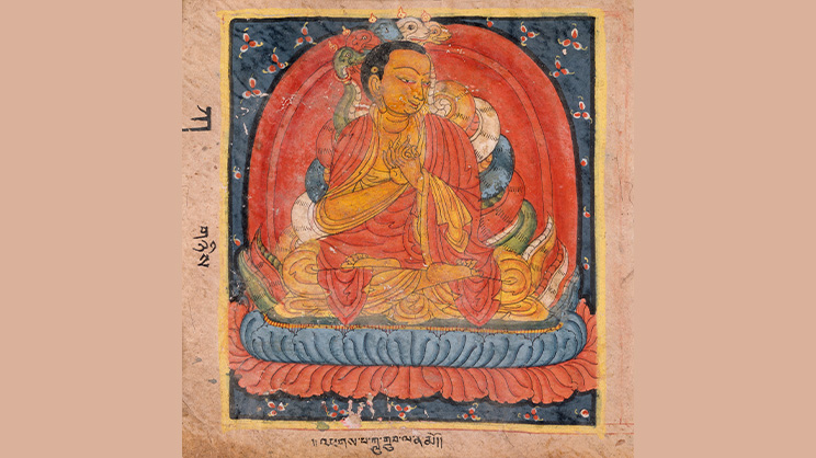 ―Imagen de Nagaryuna (nótense las cinco deidades naga sobre su cabeza), folio de una compilación de dharanis, monasterio de Shalu, Tíbet Central, finales del s. XIV o principios del s. XV e. c., acuarela opaca y tinta sobre papel. Imagen de Los Angeles County Museum of Art (EE.UU.), Public domain, via Wikimedia Commons―