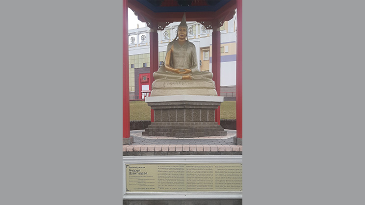 ―Estatua de Shantideva, templo budista “Morada dorada del Buddha Shakyamuni”, Elista, República de Kalmykia (Federación de Rusia), fundado en 2005. Imagen de LEhAN, CC BY-SA 4.0, via Wikimedia Commons―