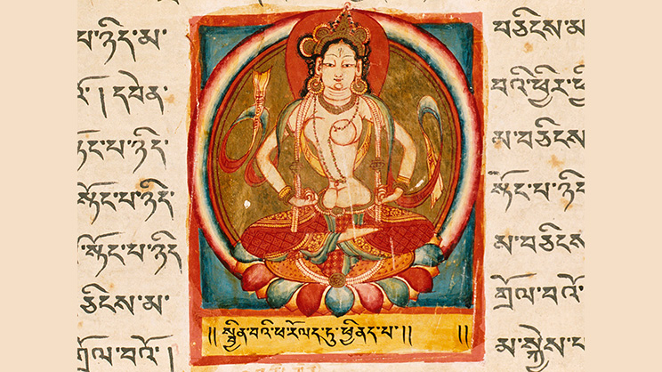―Representación antropomórfica de la Perfección de la Generosidad (Danaparamita), folio del Sutra de la perfección de la sabiduría en cien mil líneas, monasterio de Tholing, distrito de Maryul, Tíbet Occidental, s. XI e. c., tinta, acuarela opaca y oro sobre papel. Imagen de Los Angeles County Museum of Art (EE.UU.), Public domain, via Wikimedia Commons―