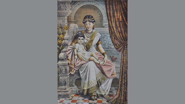 ―El príncipe Siddhartha con su tía materna la reina Mahaprajapati Gautami, que se encargó de la crianza de Siddhartha tras el fallecimiento de su madre, la reina Maya. Litografía de Maligawage Sarlis (1880-1955), (Sri Lanka). Imagen MediaJet, 2009, Public domain, via Wikimedia Commons―