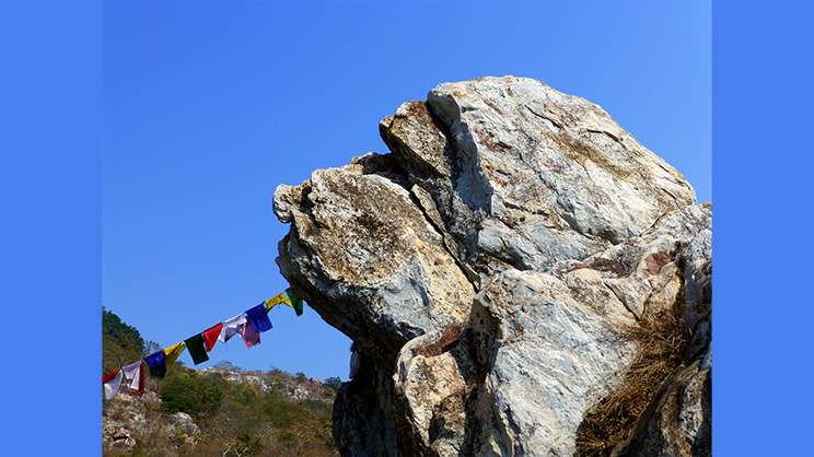―Roca en forma de cabeza de buitre, que dio lugar al topónimo “Pico del Buitre” (Grijakuta), Rayagrija, Bihar (India). Todos los Buddhas del pasado, del presente y del futuro revelan innumerables sutras majayana en este lugar. Imagen de Dharma from Penang, Malaysia, CC BY 2.0, via Wikimedia Commons―