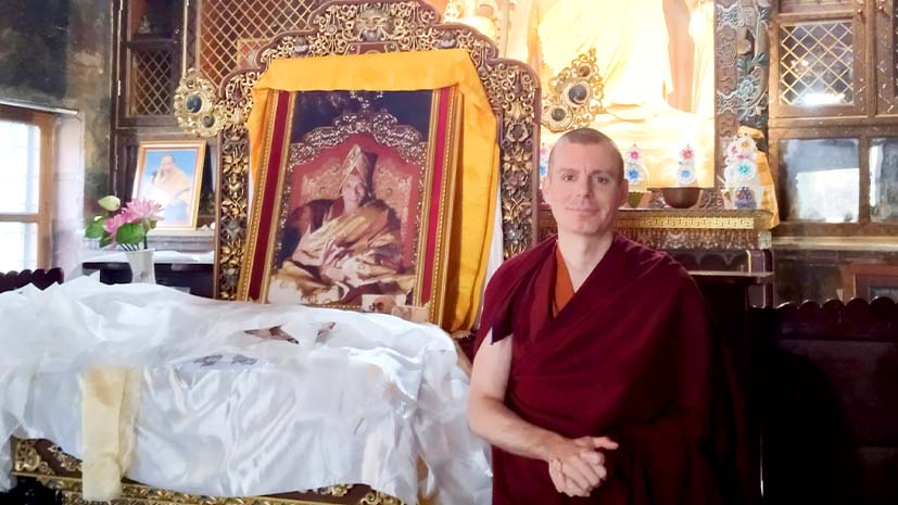 —Khenpo Rinchen Gyaltsen en Dharmaswami Maharaja Buddhavihara, en Lumbini (Nepal) donde se ordenó monje en 2003. A su lado, imagen del maestro que le otorgó la iniciación, S. Em. Chogye Trichen Rinpoché (1919-2007)—