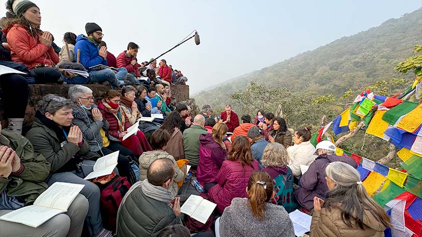 —Khenpo Rinchen Gyaltsen en el Pico del Buitre (India), el lugar donde el Buddha enseñó por primera vez el ”Sutra del corazón”, junto a la asamblea de algunos de sus estudiantes y discípulos. Enero, 2024—
