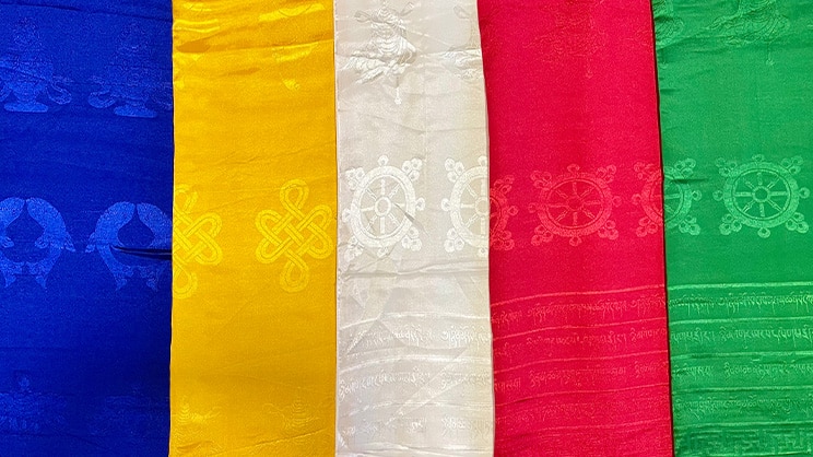 ―Khatas o pañuelos de seda ceremoniales de los cinco colores. Cada color tiene un significado simbólico importante en el budismo tibetano. Se pueden apreciar los delicados diseños bordados en cada khata, que incluyen símbolos auspiciosos (ashtamangala) como parejas de peces dorados (visible en la khata azul), nudos sin fin (visible en la khata amarilla) y ruedas del Dharma (visibles en las khatas blanca, roja y verde)―