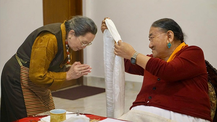 ―Su Santidad Sakya Trizin 41, Gongma Trichen Rinpoché (dcha.) devuelve como bendición una khata a su esposa, Su Eminencia Gyalyum Tashi Lhakyi (izda.), después de que se la ofreciera. Foto tomada durante la reciente celebración de cumpleaños de Su Eminencia en Puruwala, India. 4 de marzo de 2025. Fuente: Dagmo Kalden Sakya―