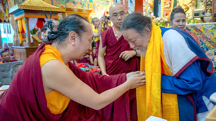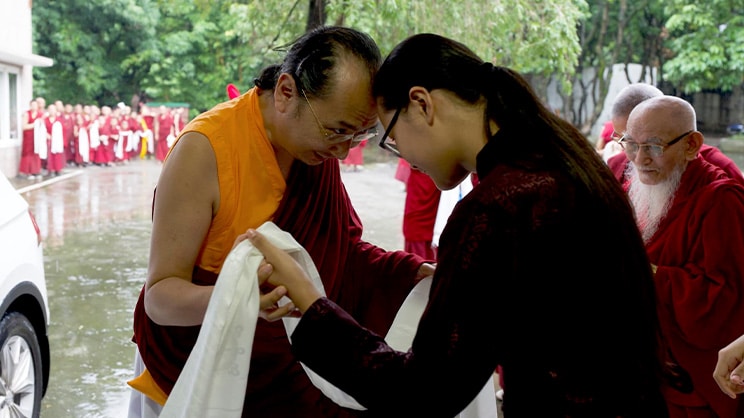 ―El Venerable Khenpo Rinchen Gyaltsen bendice a un miembro de la sangha Paramita después de recibir su ofrenda de khata. Foto del Centro Budista Sakya de Pedreguer, España.―