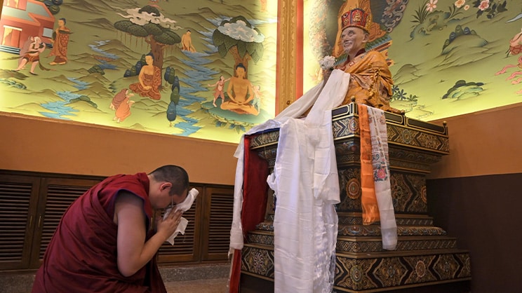 ―Su Eminencia Dezhung Rinpoché 4 se inclina respetuosamente ante una estatua de Chogye Trichen Rinpoché en la estupa Jamchen Vijaya, ubicada en Narayanthan Hill, Katmandú, el 20 de octubre de 2024. La imagen muestra el profundo respeto y devoción expresados mediante este gesto tradicional, con una khata blanca ofrecida al maestro representado en la estatua. Fuente: Tharlam Monastery―