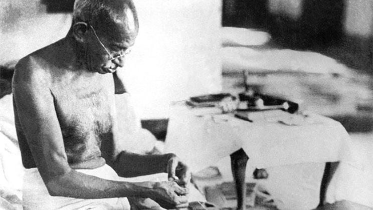 ―Mahatma Gandhi promovió la idea de vivir de manera sencilla y en armonía con la naturaleza. Consideraba que esta forma de vida no solo era un estilo de vida, sino también un camino hacia la autosuficiencia y la paz interior. Al disminuir las necesidades materiales, sostenía que las personas podían liberarse de las ataduras del consumismo y concentrarse en valores más elevados, como la verdad, la no violencia (“ahimsa”) y el servicio al bienestar de todos (“sarvadaya”). Foto de Gandhi hilando en Birla House, Bombay, agosto de 1942. Imagen de Vando, Public domain, via Wikimedia Commons―