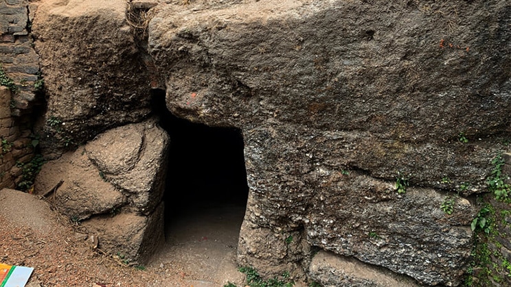 ―Una cueva de meditación de Milarepa, a unos 22 kilómetros de la ciudad de Katmandú, en la cima de una colina sobre la histórica ciudad de Sankhu (Nepal). Foto de Nepal Kameleon―