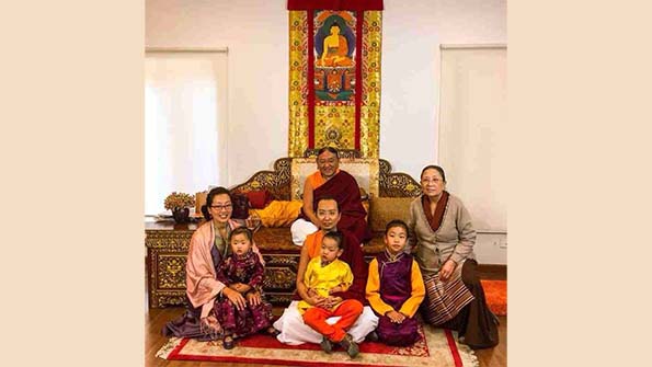 —Yetsunma Kunga Trinley Palter (centro dcha.) y miembros de su familia inmediata: su abuelo, S. S. el 41.º Sakya Trizin, Gongma Trichen Rinpoché (centro atrás); su abuela, S. Em. Gyalyum Tashi Lhakyi (dcha.); su padre, S. S. el 42.º Sakya Trizin Ratna Vajra (centro); su madre, S. Em. Dagmo Kalden Dunkyi (izda.); y sus hermanos, S. Em. Dungsay Akasha Vajra (centro) y S. Em. Yetsunma Kunga Chimey Wangmo (izda.). 2015—