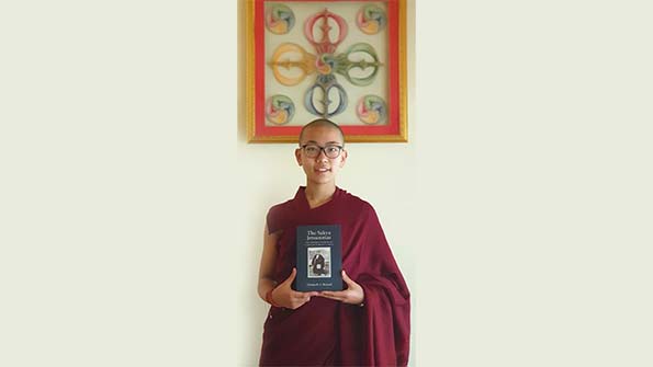 —Yetsunma Kunga Trinley Palter con una muestra de ‘The Sakya Jetsunmas: The Hidden World of Tibetan Female Lamas’ de Elisabeth A. Benard, una obra invalorable que ofrece una mirada íntima a las Yetsunmas de la familia Sakya Khon, yoguinis excelentes que se destacaron por sus logros espirituales. 2021. Imagen de S. E.m. Dagmo Kalden Dunkyi—