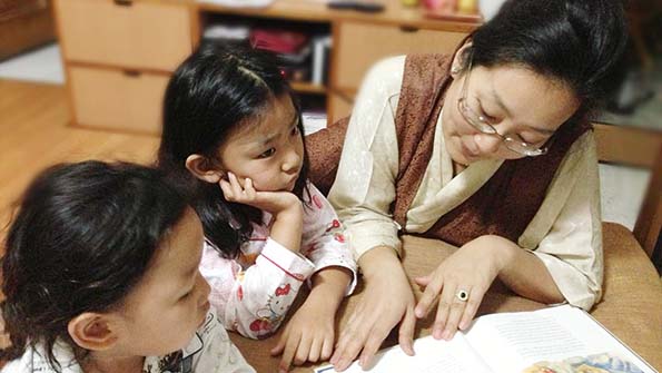 —Yetsunma Kunga Trinley Palter (centro) y su hermano S. Em. Dungsay Akasha Vajra (izda.) a un edad muy joven, leyendo con su madre antes de acostarse. Imagen de S. Em. Dagmo Kalden Dunkyi—