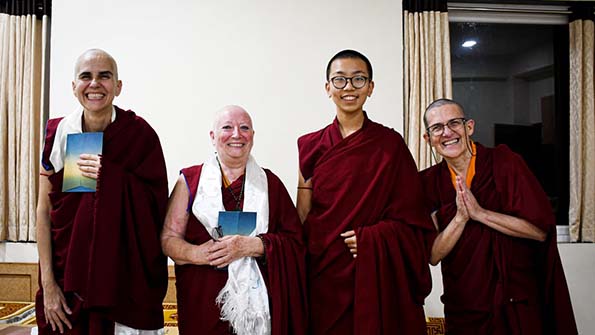 —Yetsunma Kunga Trinley Palter (centro dcha.) con las venerables Pema (izda.), Kunga (centro izda.) y Jamyang (dcha.) después de la entrevista que realizaron en enero del 2023 en Sakya Monastery, en Bodhgaya (India). Imagen de S. S. el 41.º Sakya Trizin Ratna Vajra—